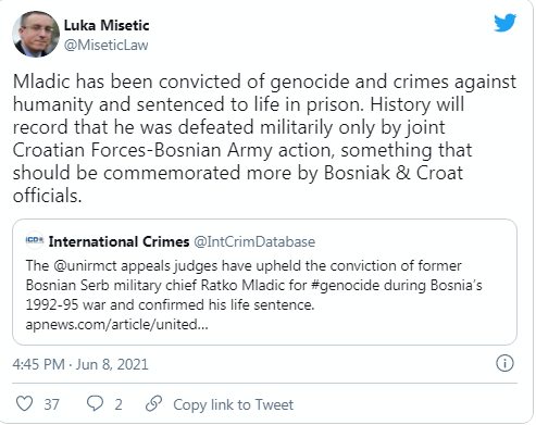“Mlladiq është dënuar për gjenocid dhe krime kundër njerëzimit dhe është dënuar me burgim të përjetshëm. Historia do ta mbaj në mend se ai u mposht vettëm nga një aksion i përbashkët i ushtrisë Kroate dhe Boshjake, diçka që duhet të kujtohet më shumë nga zyrtarët Boshnjak dhe Kroat”, ka shkruar Misetic.